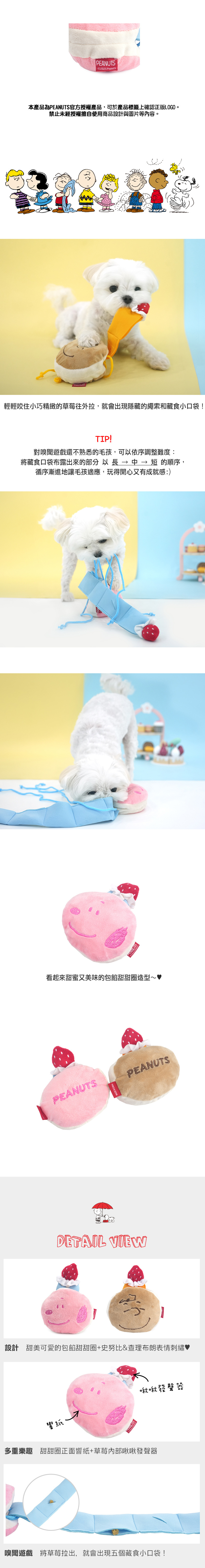 史努比與查理布朗化身成草莓甜甜圈,圓潤鬆軟材質搭配刺繡表情圖案,內藏乳膠發聲玩具可互動又療癒