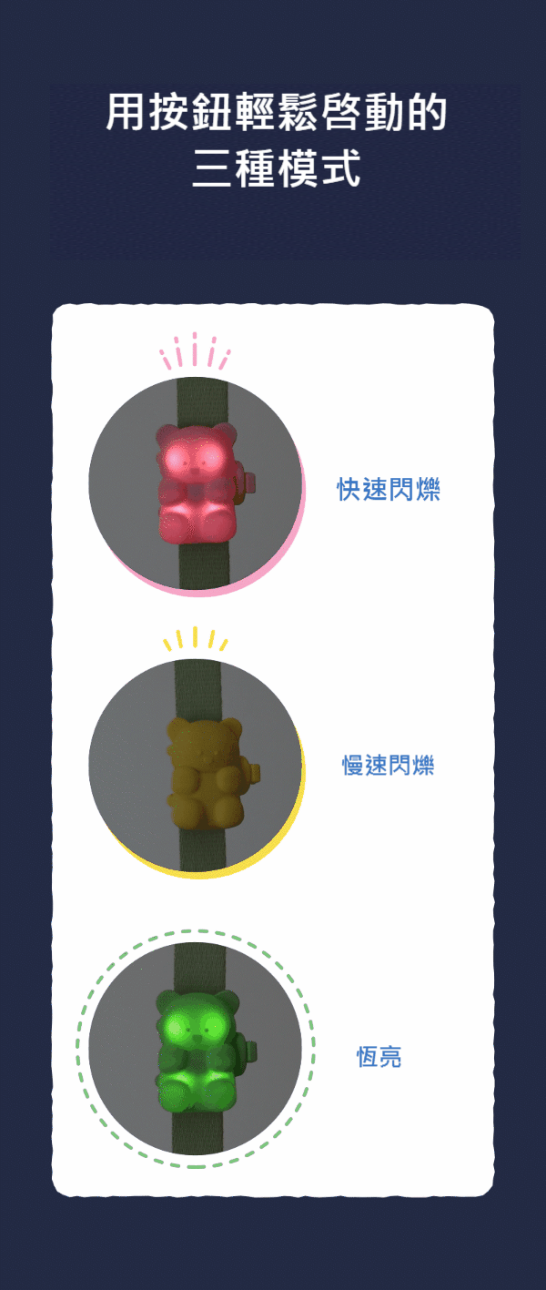 有三種亮燈模式 ➊ 快速閃爍 ➋ 慢速閃爍 ➌ 恆亮