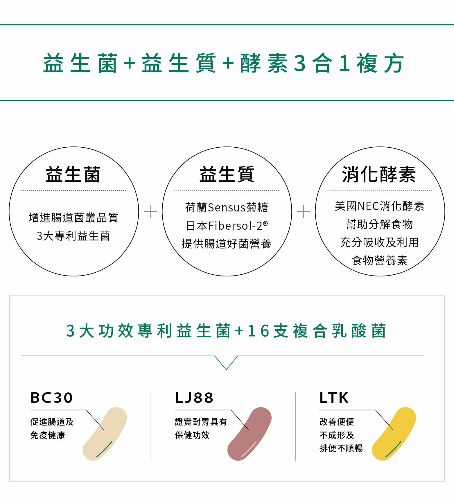 ✔增加好菌、營養補充、幫助消化三管齊下,益生菌+益生質+酵素3合1複方,腸道保健面面俱到!