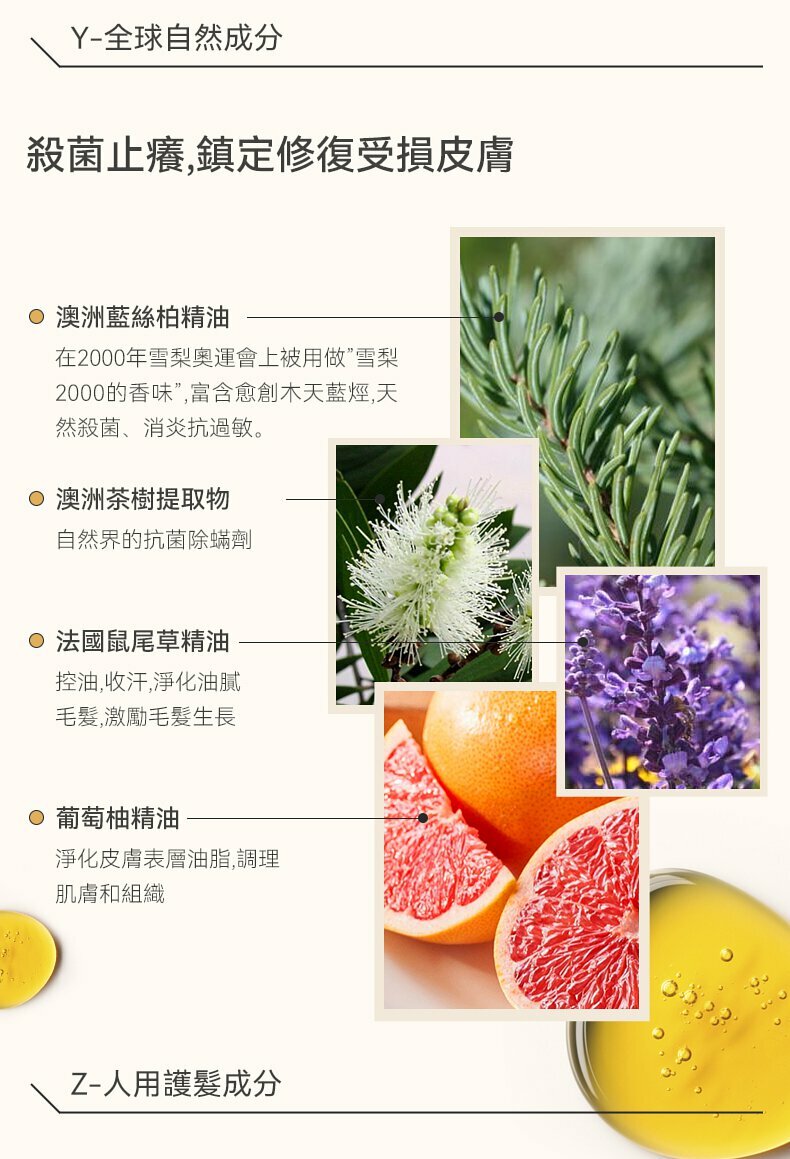 ●添加萃取植物精油,有效殺菌、淨化油膩毛髮、調理肌膚組織