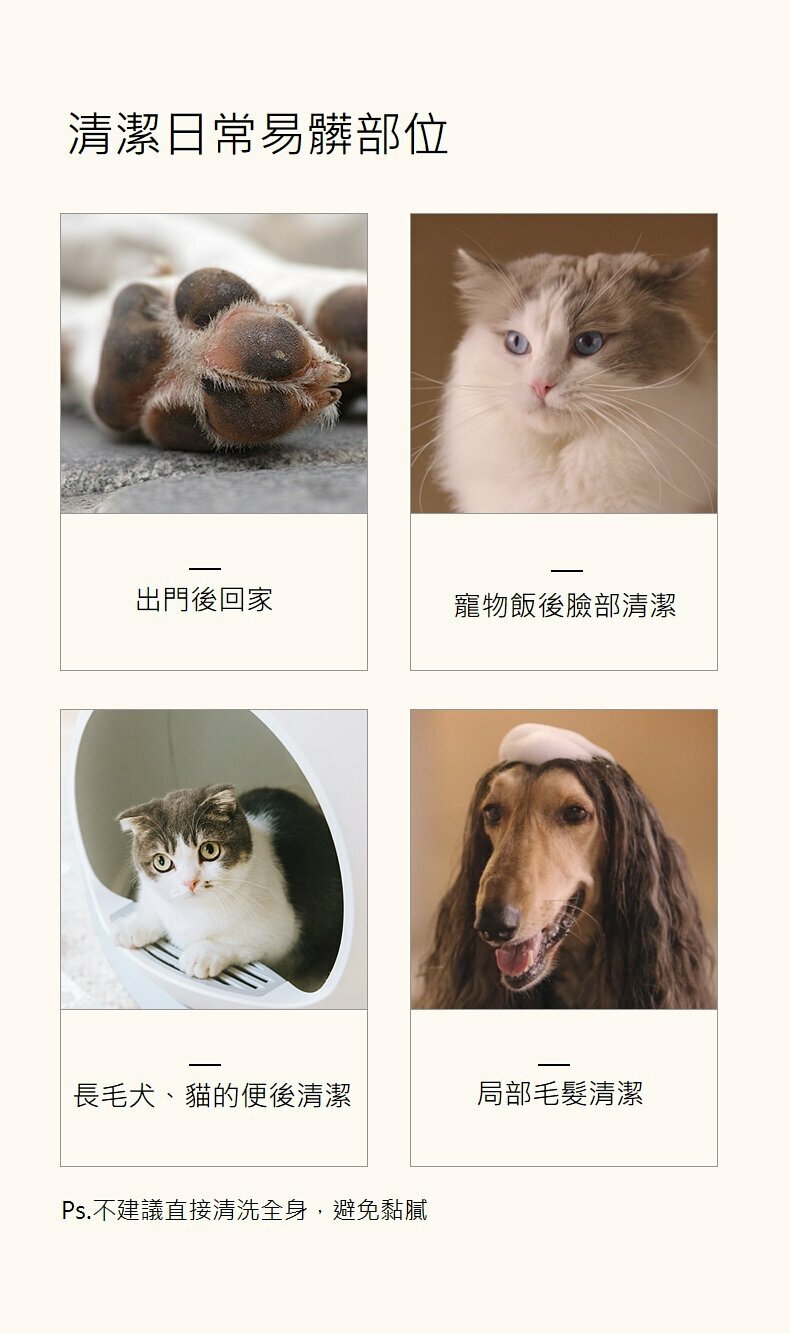●局部清潔敲方便,散步後的腳掌、飯後的嘴角,迅速整潔