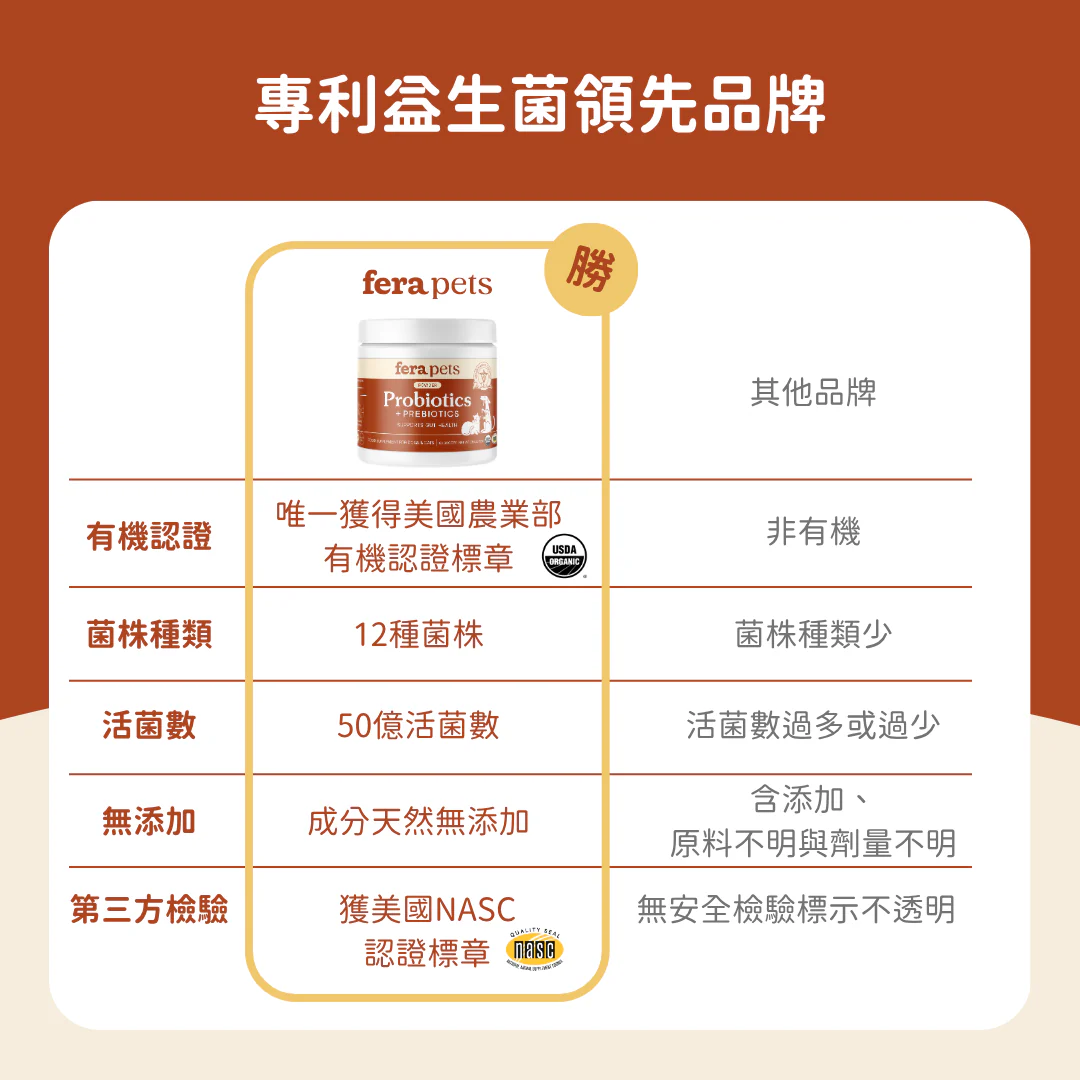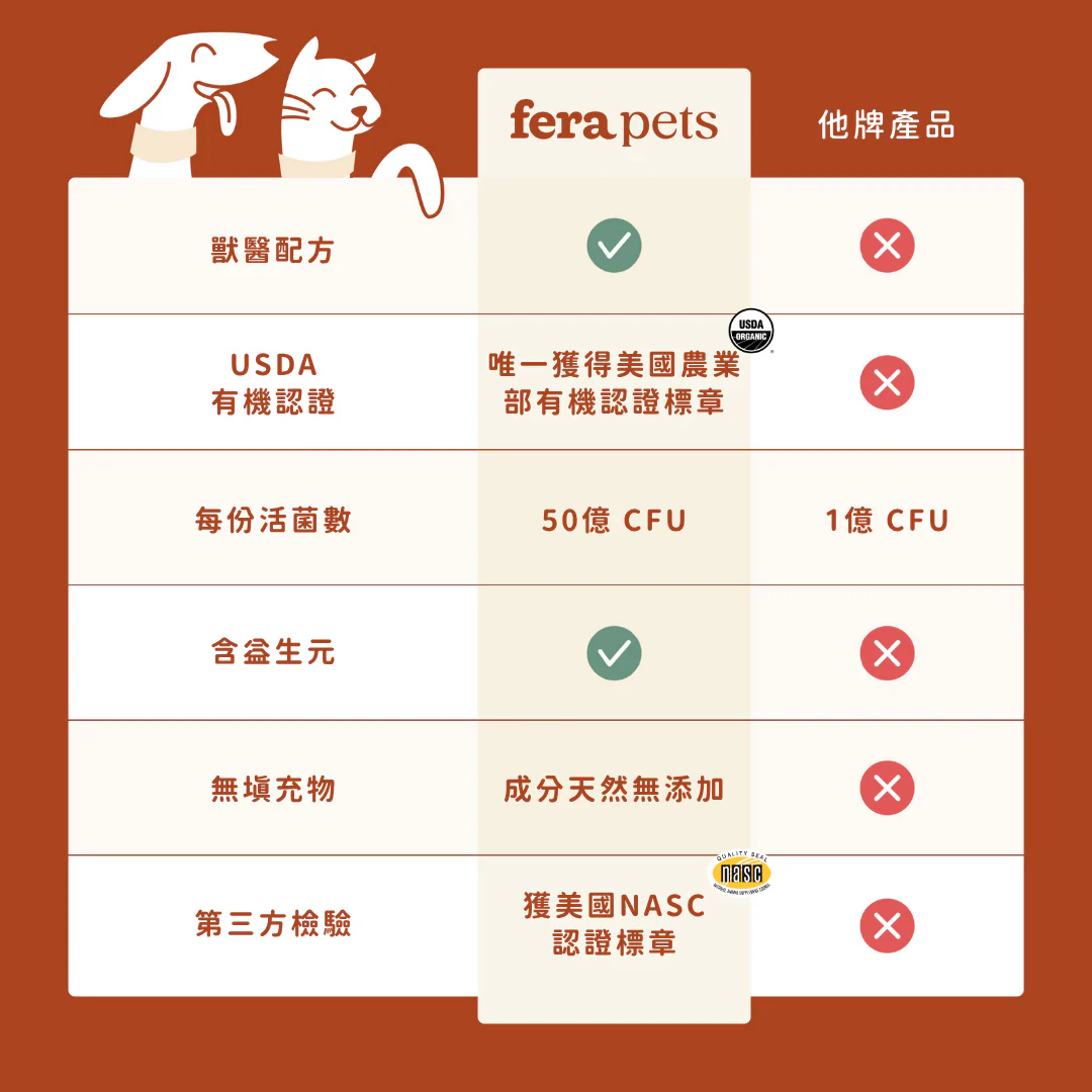 Fera Pets 飛樂沛益生菌是 唯一獲得美國農業部有機認證(USDA ORGANIC)的益生菌。