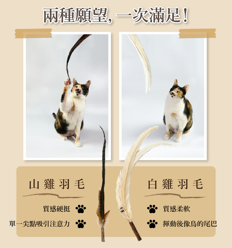 山雞羽毛較為硬挺,單根設計讓貓咪可以追著尖點跑