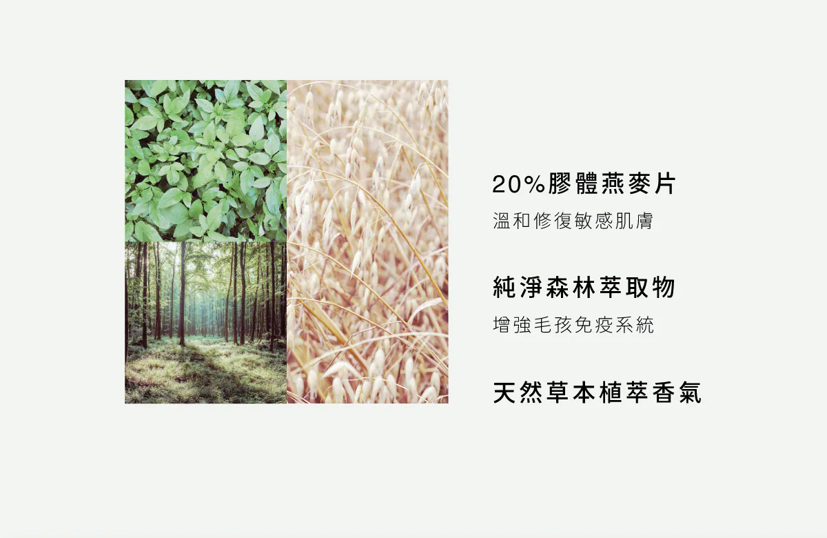 100%天然成分洗毛精,獨家添加高達20%膠體燕麥片成分,幫助滋潤皮膚,減少搔癢。