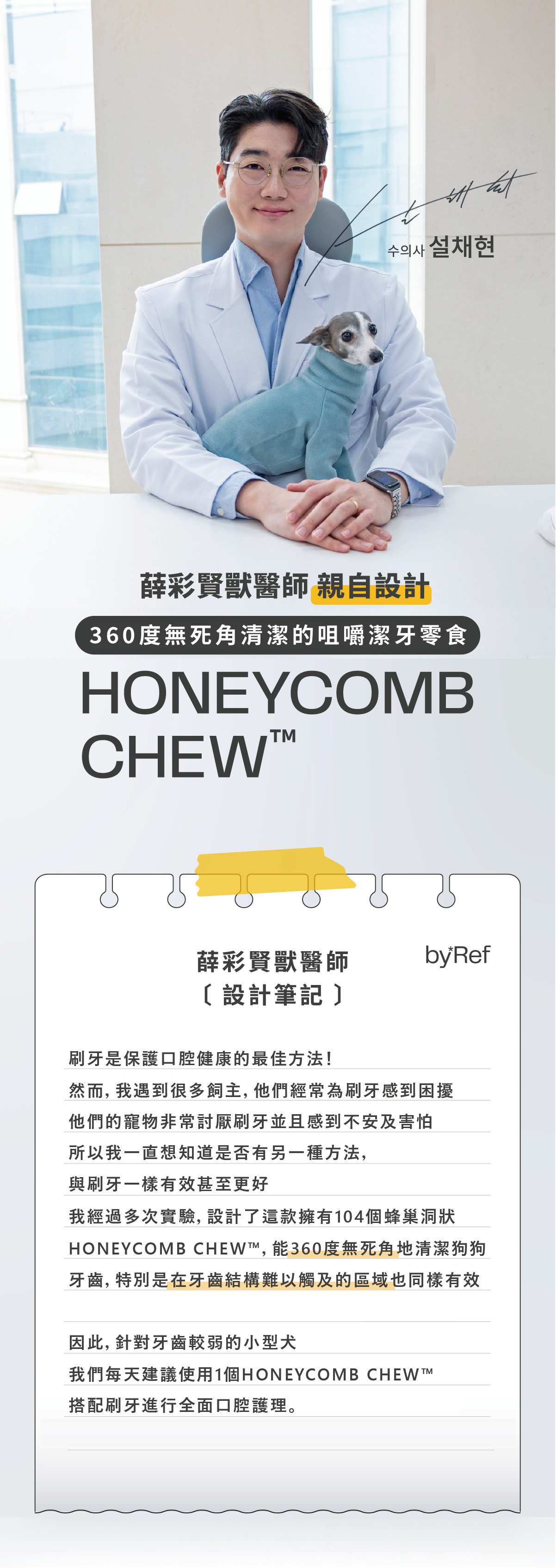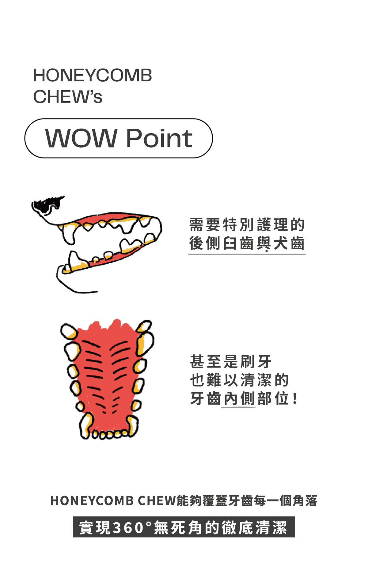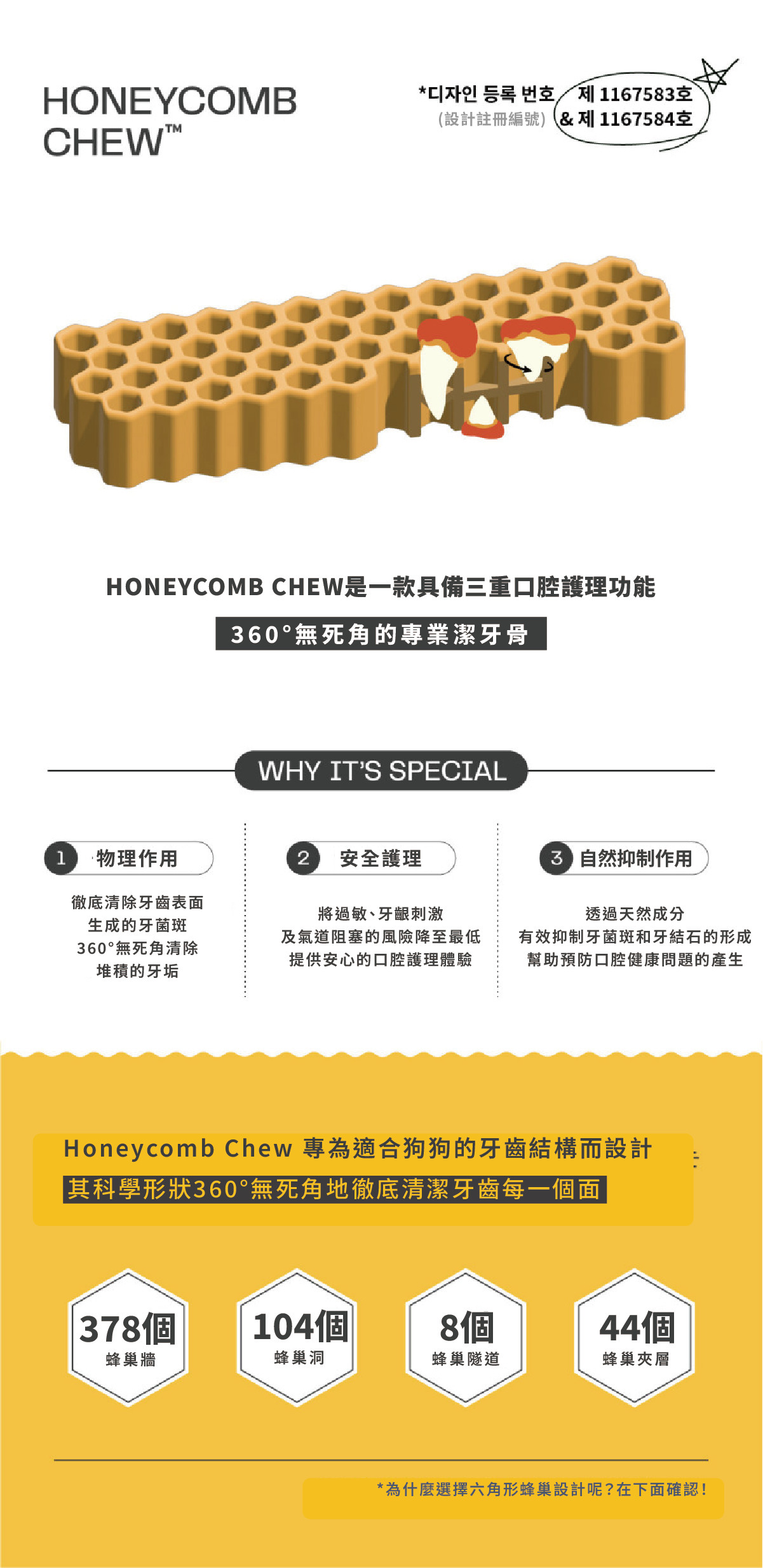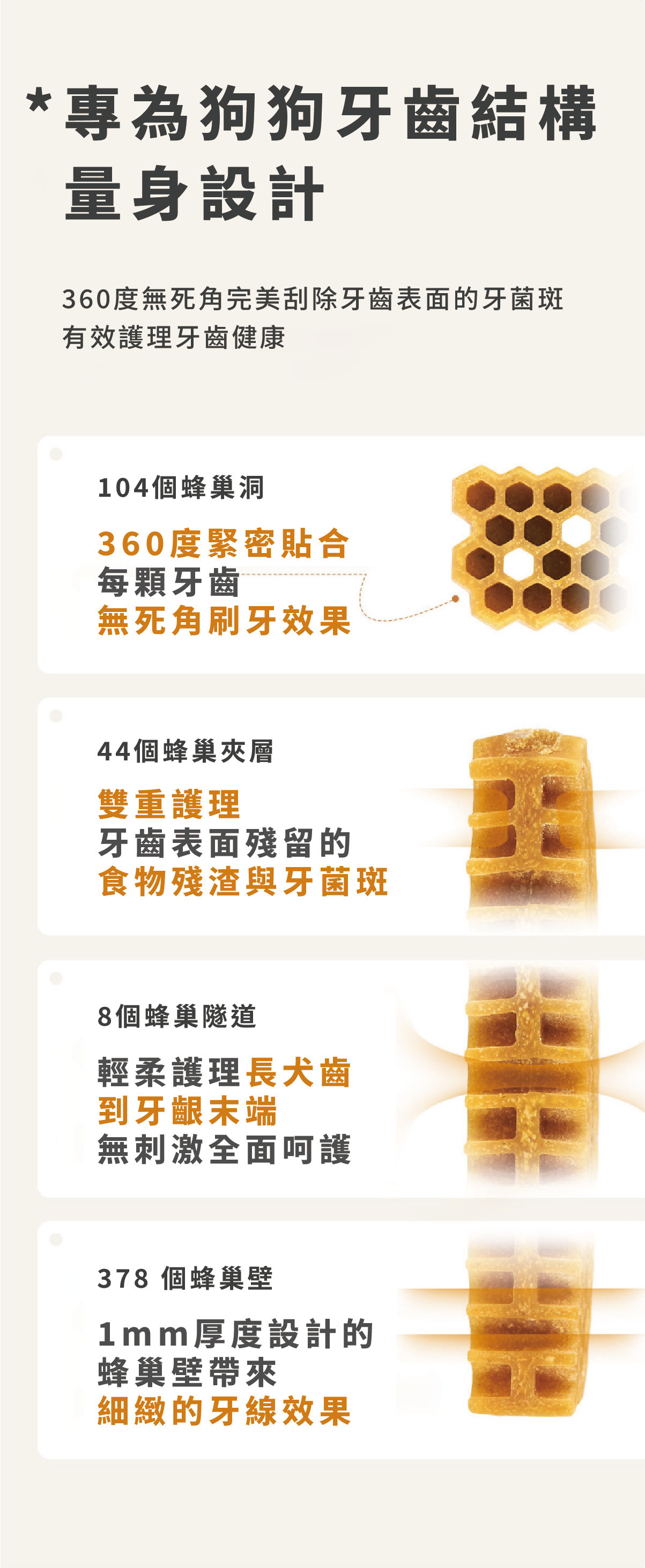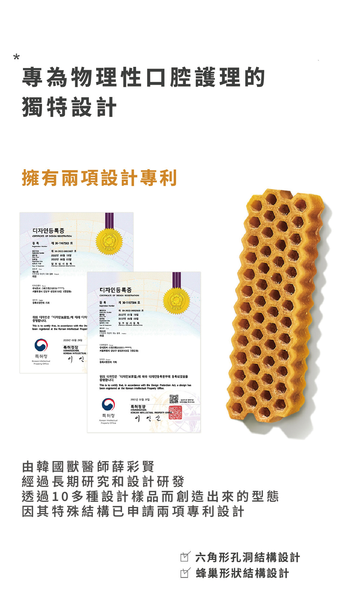 用科學角度為狗狗依照牙齒結構來設計,蜂巢形狀能有效覆蓋所有牙齒表面,提供360度的全面護理,無縫隙去除牙菌斑,由韓國寵物行為獸醫師薛彩賢設計研發,以獨特的六角形及蜂巢形狀達成潔牙效果