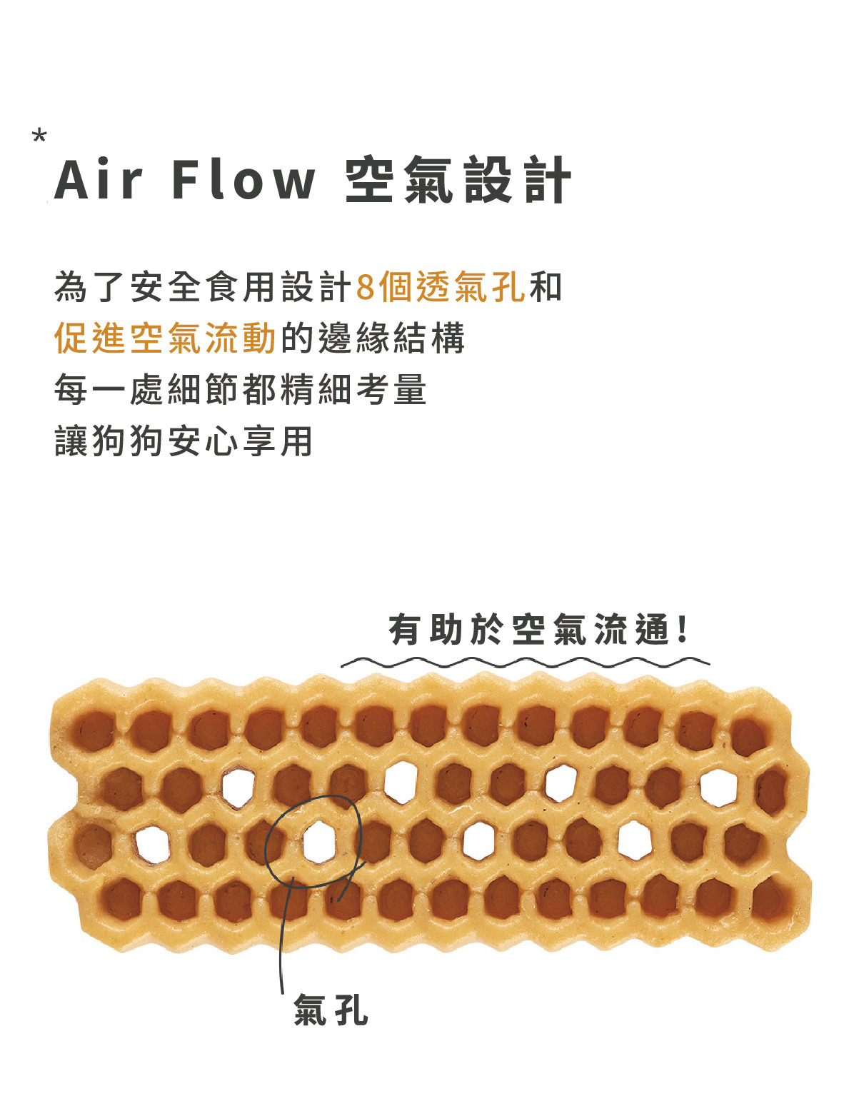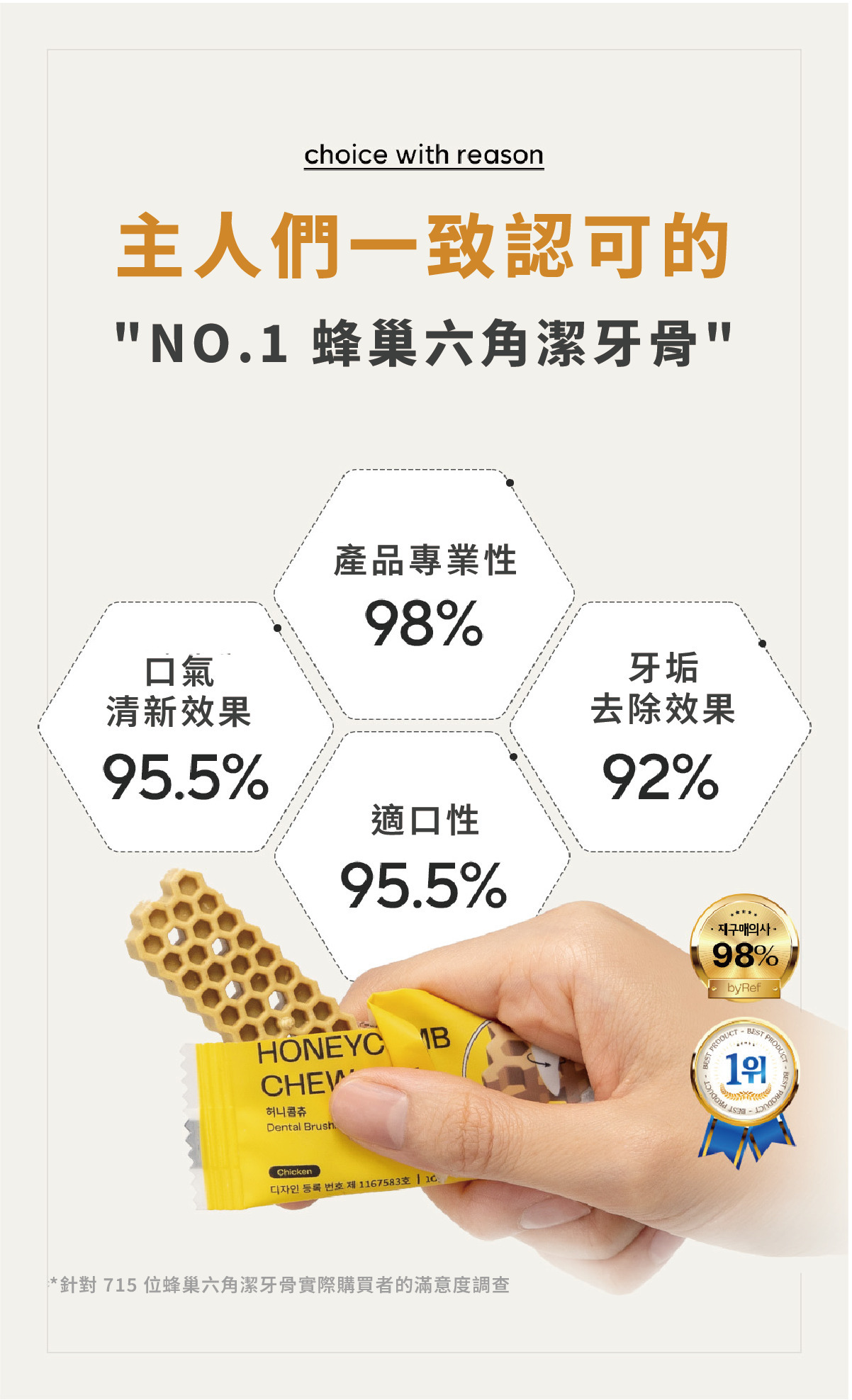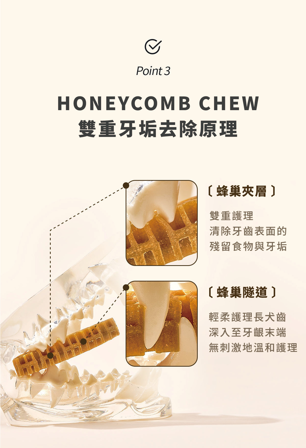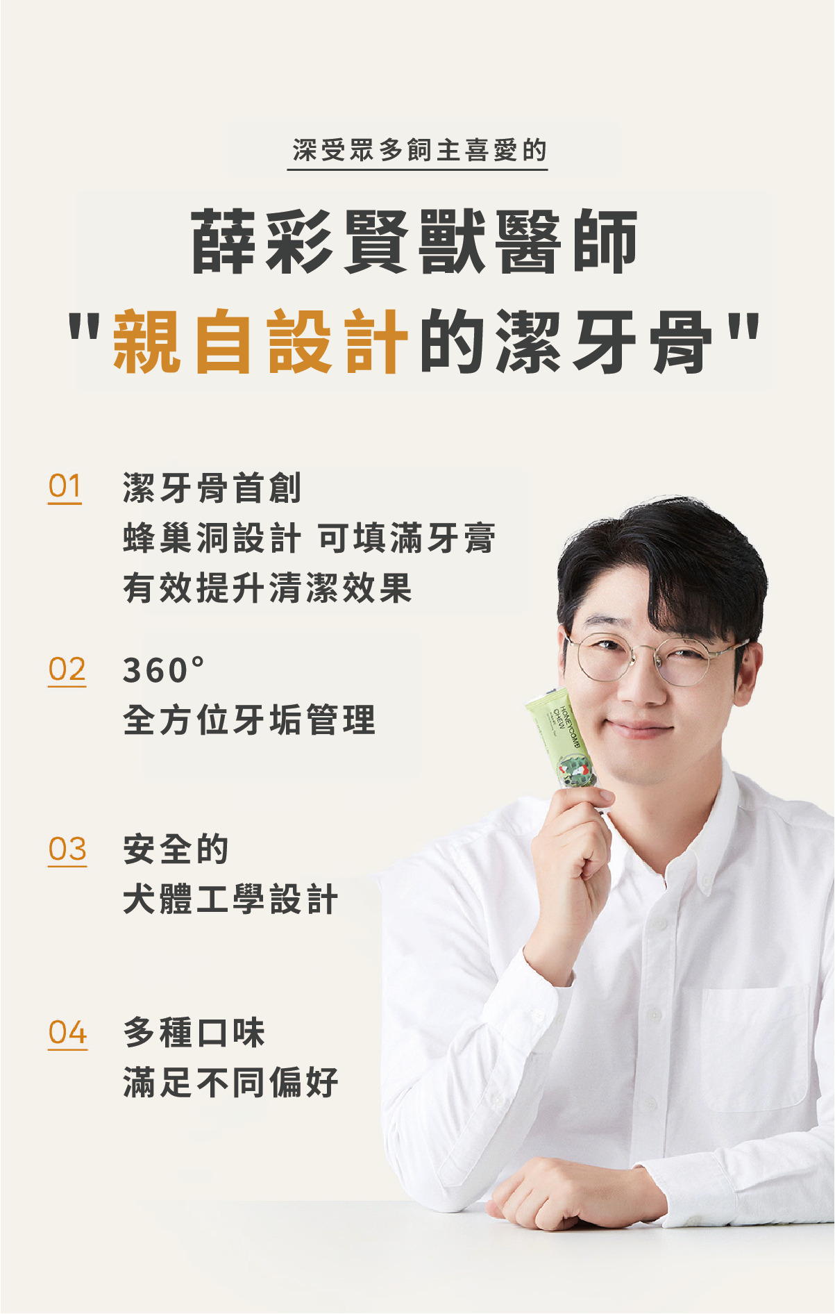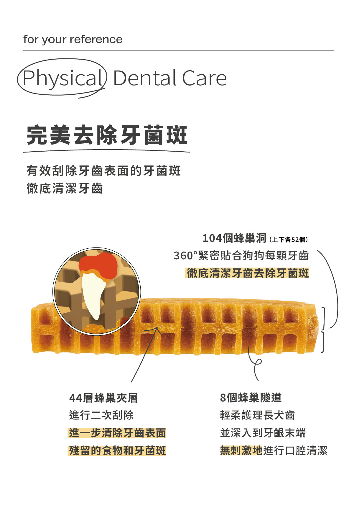 用科學角度為狗狗依照牙齒結構來設計,蜂巢形狀能有效覆蓋所有牙齒表面,提供360度的全面護理,無縫隙去除牙菌斑,由韓國寵物行為獸醫師薛彩賢設計研發,以獨特的六角形及蜂巢形狀達成潔牙效果
