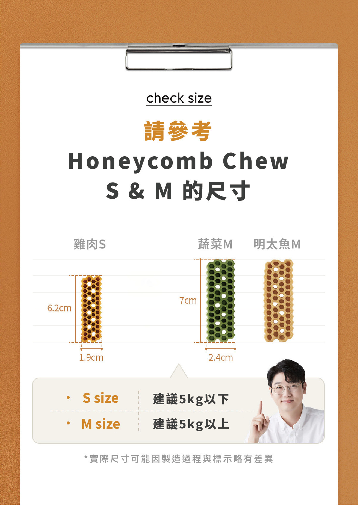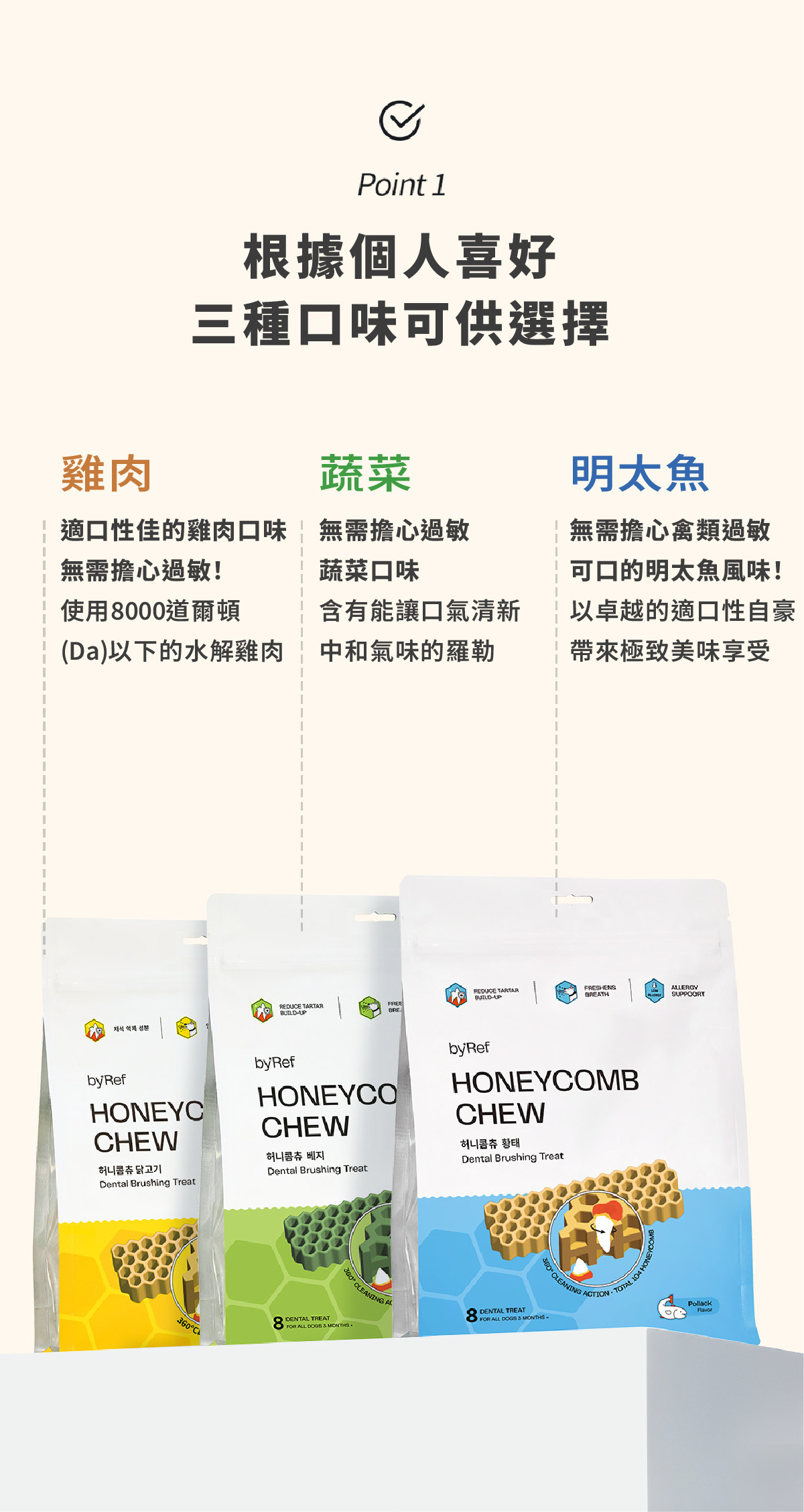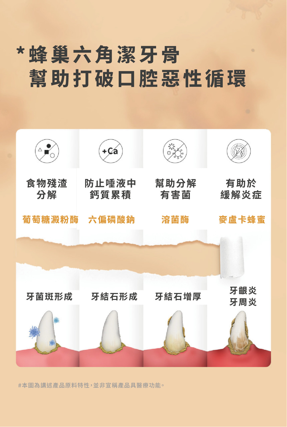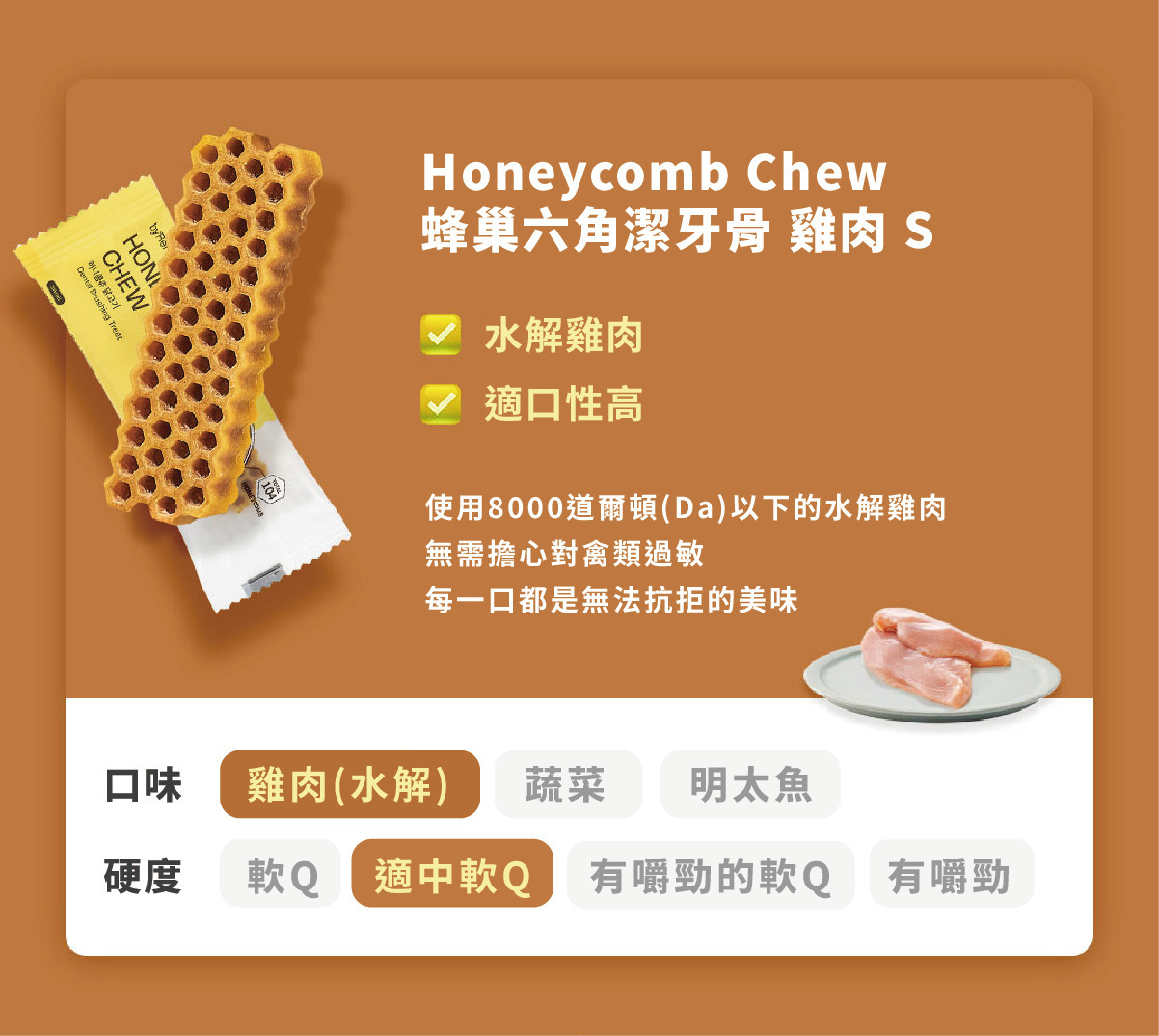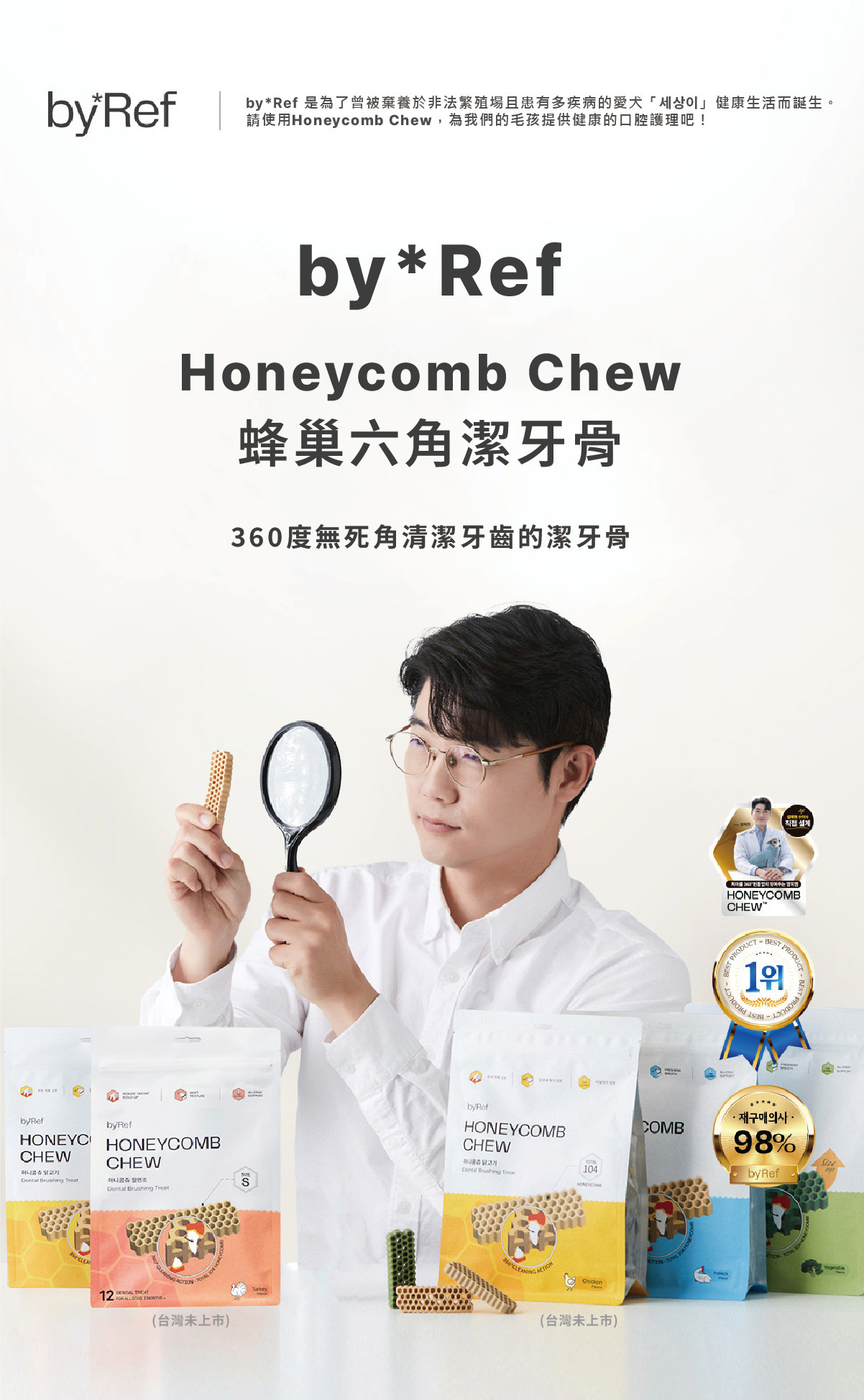 用科學角度為狗狗依照牙齒結構來設計,蜂巢形狀能有效覆蓋所有牙齒表面,提供360度的全面護理,無縫隙去除牙菌斑,由韓國寵物行為獸醫師薛彩賢設計研發,以獨特的六角形及蜂巢形狀達成潔牙效果