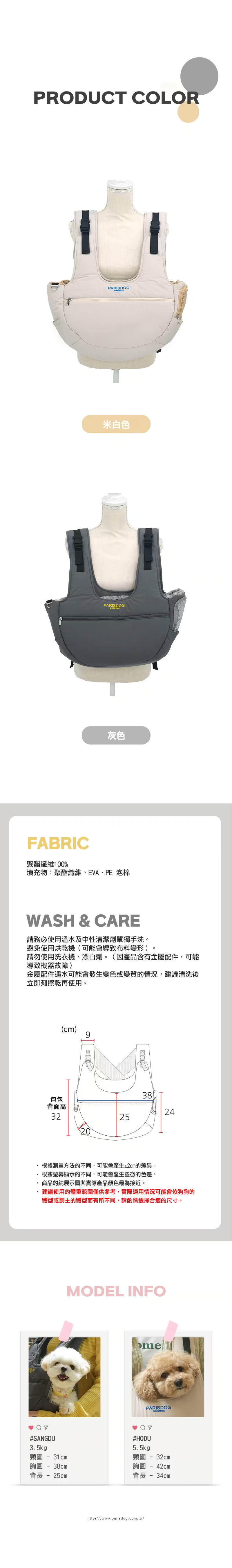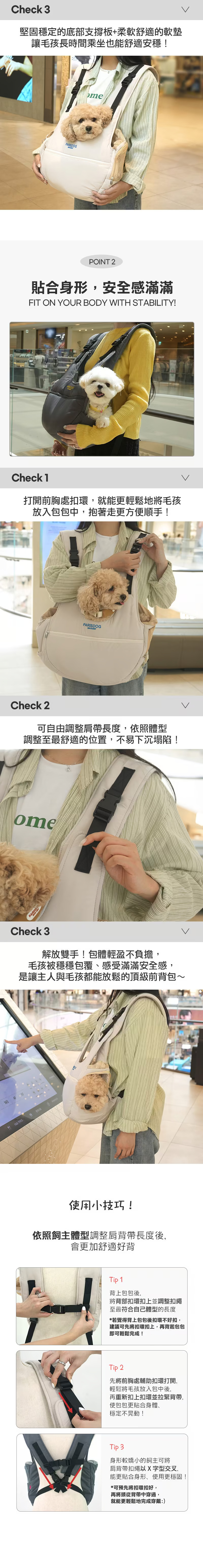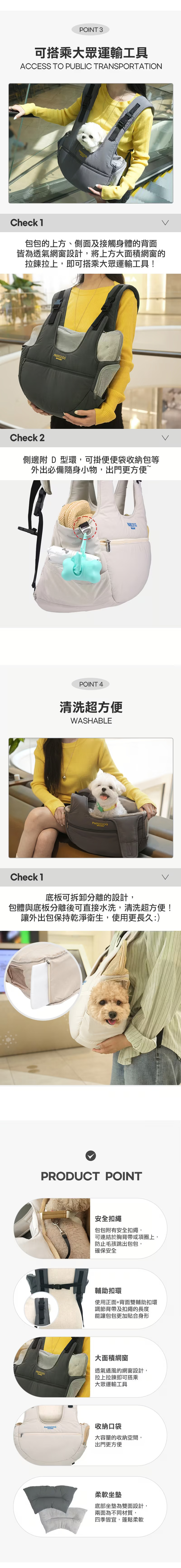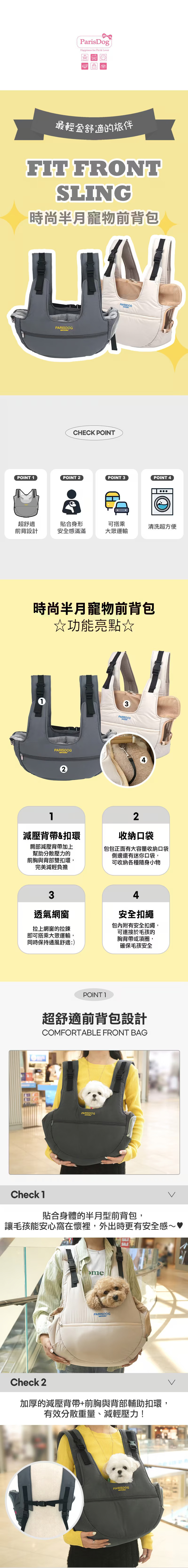 時尚半月寵物前背包,採用肩部減壓背帶與雙扣環設計,分散壓力更舒適。包包正面有大容量收納袋與側邊小口袋,可放置隨身小物。通風網窗設計,拉上即可搭乘大眾運輸,內附安全扣繩確保毛孩出行安全。