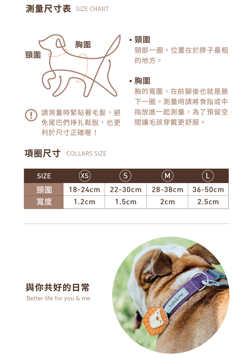 針對不同體型的狗狗,如中大型犬若選擇過度寬鬆的項圈,若突然狗狗暴衝,項圈因用力拉扯而造成毀損,很可能造成意外。